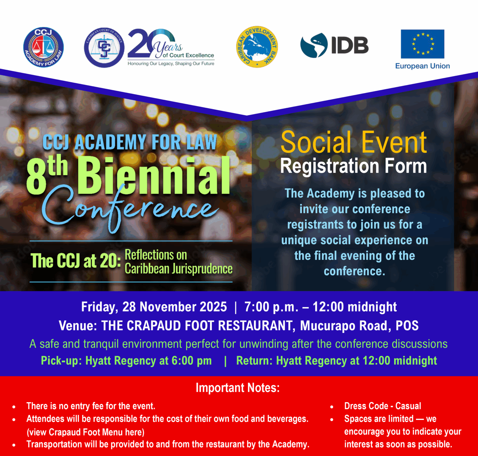 The CCJ Academy for Law will host its social event on 28 November 2025, following the conclusion of conference activities, at the Crapaud Foot Restaurant in Port of Spain. Interested persons are asked to register their interest as soon as possible